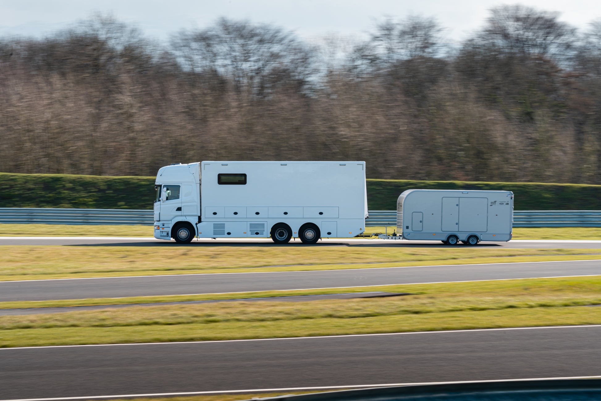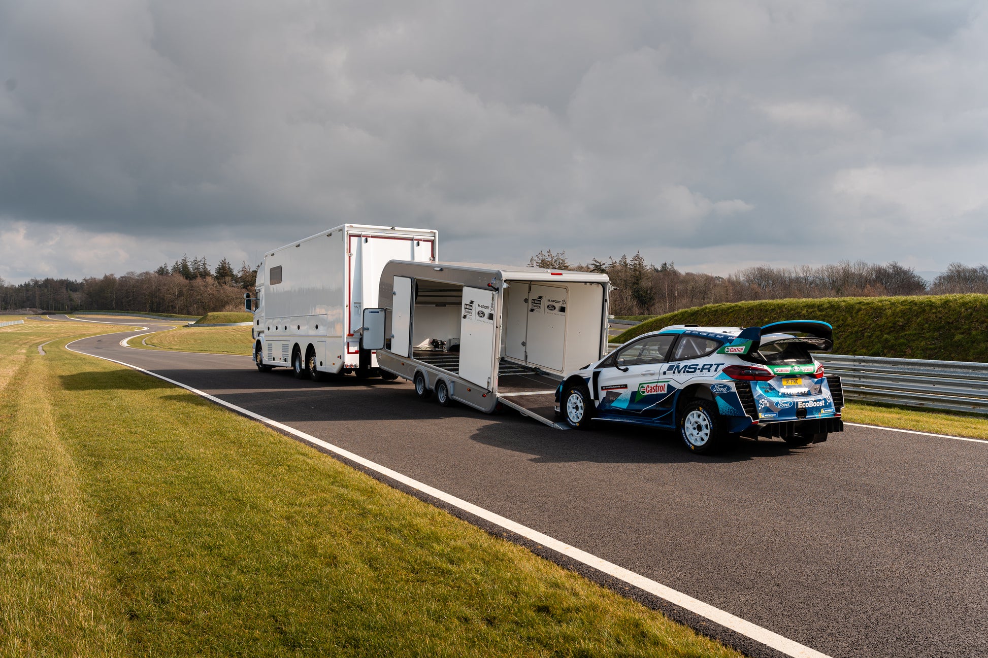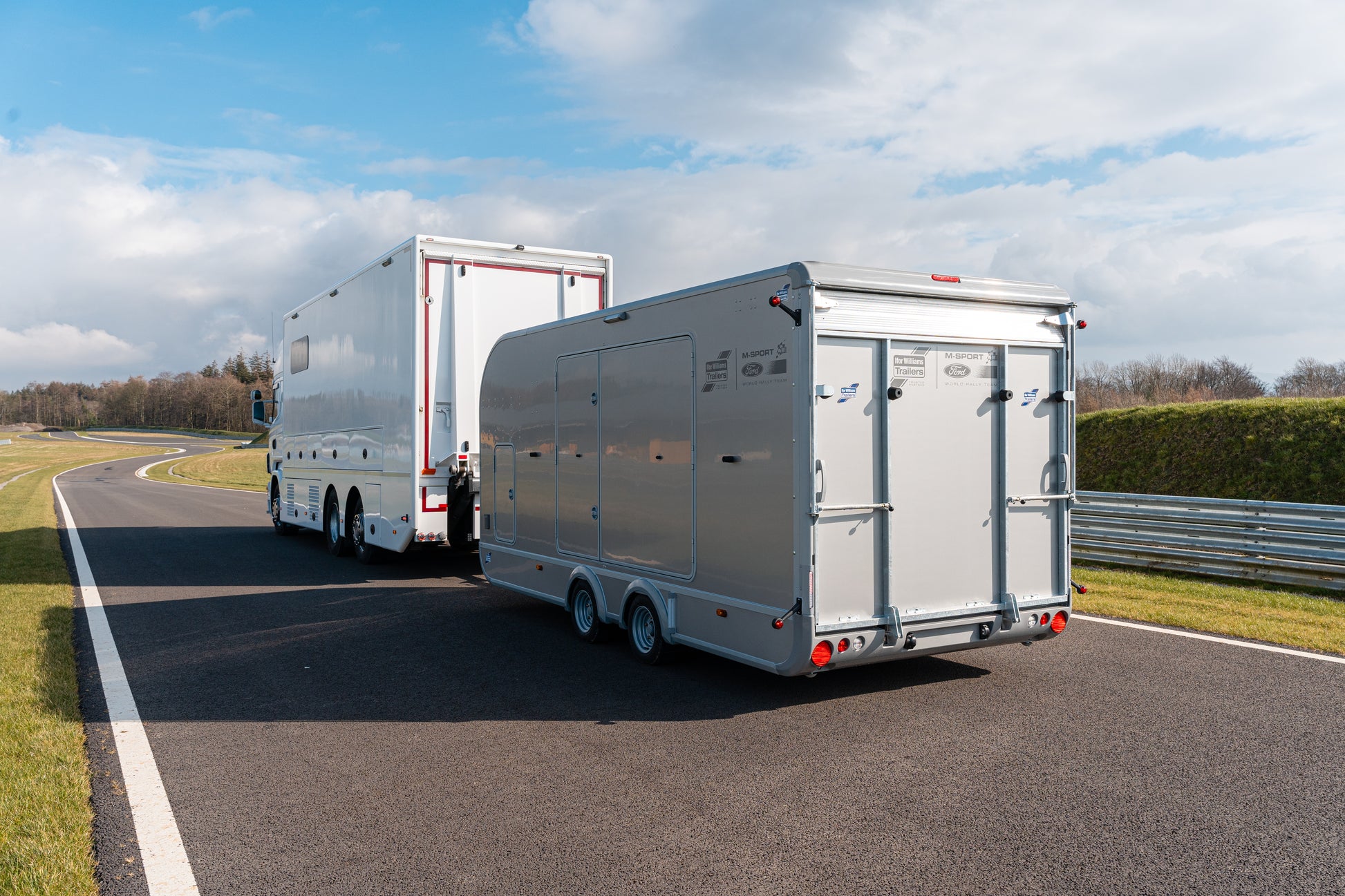 An electrically operated winch is available and the sliding bracket means the whole assembly can move from side to side to allow for variation in vehicle towing eye position. The optional tyre rack and workbench, which are mounted to the front of the trailer, can accommodate a set of differently sized wheels and gives a fully functional working area over a durable large front storage cabinet constructed from lightweight material. Two large side doors give access to the vehicle for restraining.